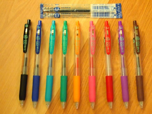 Zebra Sarasa Push Clip Gel Ink Pens with refill — his pen writes like a dream. 0.4mm has very sharp lines with no bleeding or spotty ink blobs. Comes in a wide variety of colors & pen point thickness (including the ones shown). Pen cost approx. $3.00 USD each. Refill cost approx. $1.25 each.