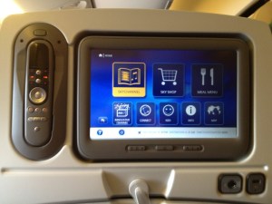 3. Each seat has its own interactive TV screen, which you can watch various videos, movies &/or listen to music. There is also a USB connector, so you can plug in your MP3 player & listen to your own music. Also, the movie selection was really good. There were about 12 or so movies to choose from, so you don’t have to watch the same Disney channel kids movie on repeat while on a long flight. The only downside is you can’t adjust/swivel the TV screen, so if you want to prop your head to the side, you will get an annoying glare from the screen’s privacy coating.