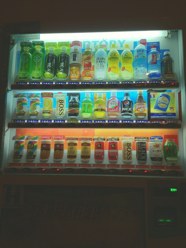 The legendary vending machine(s) of Japan. This one dispenses both hot & cold drinks. Yes, I said HOT & COLD. The drinks marked in blue are cold. The drinks marked in red are hot…& yes, they do come out HOT, not lukewarm. Perfect for the chilly morning weather!
