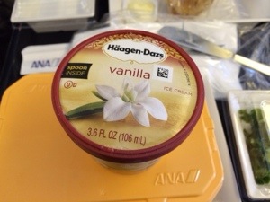 After our amazingly epic in-flight meal (the first of two meals), they served us Haägen Dazs ice cream…which is my favorite brand of ice cream by the way. So, I was a “pretty kitty” after that.