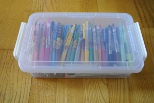 What I am about to show is only a portion of my pen collection (with a couple of mechanical pencils thrown into the mix). I’ve got many more pens scattered around the house & stashed away in old storage boxes. A while back I got this large craft box from the Container Store & quickly filled it with stickers, pens & other supplies.