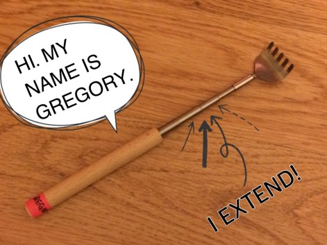 Well, enough of that rant. I’ve found a solution to my itchy conundrum; A $7.00 solution to be exact. It’s… DRUM ROLL… a back-scratcher! Yes, folks. I got a back-scratcher. It’s not just any random, cheap Chinatown bamboo twig either. This is a deluxe model, made of metal & has an extendable arm. Like all the other inanimate objects in my life, I gave it a name. It’s name is Gregory.