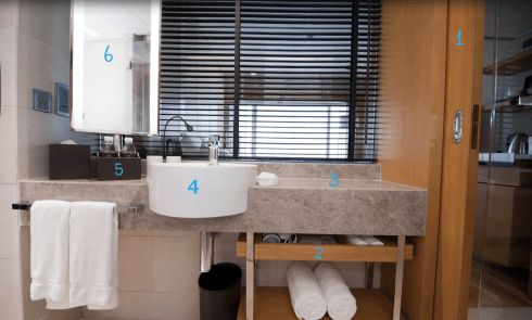 Our compact, yet practical bathroom. 1. pocket door, 2. drawer for hair dryer & complimentary toiletries, 3. spacious countertop, 4. compact sink, 5. complimentary bottled water, 6. swiveling lighted mirror