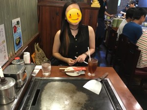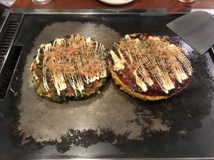 - See how excited my cousin is? Okonomiyaki grilling is serious business.