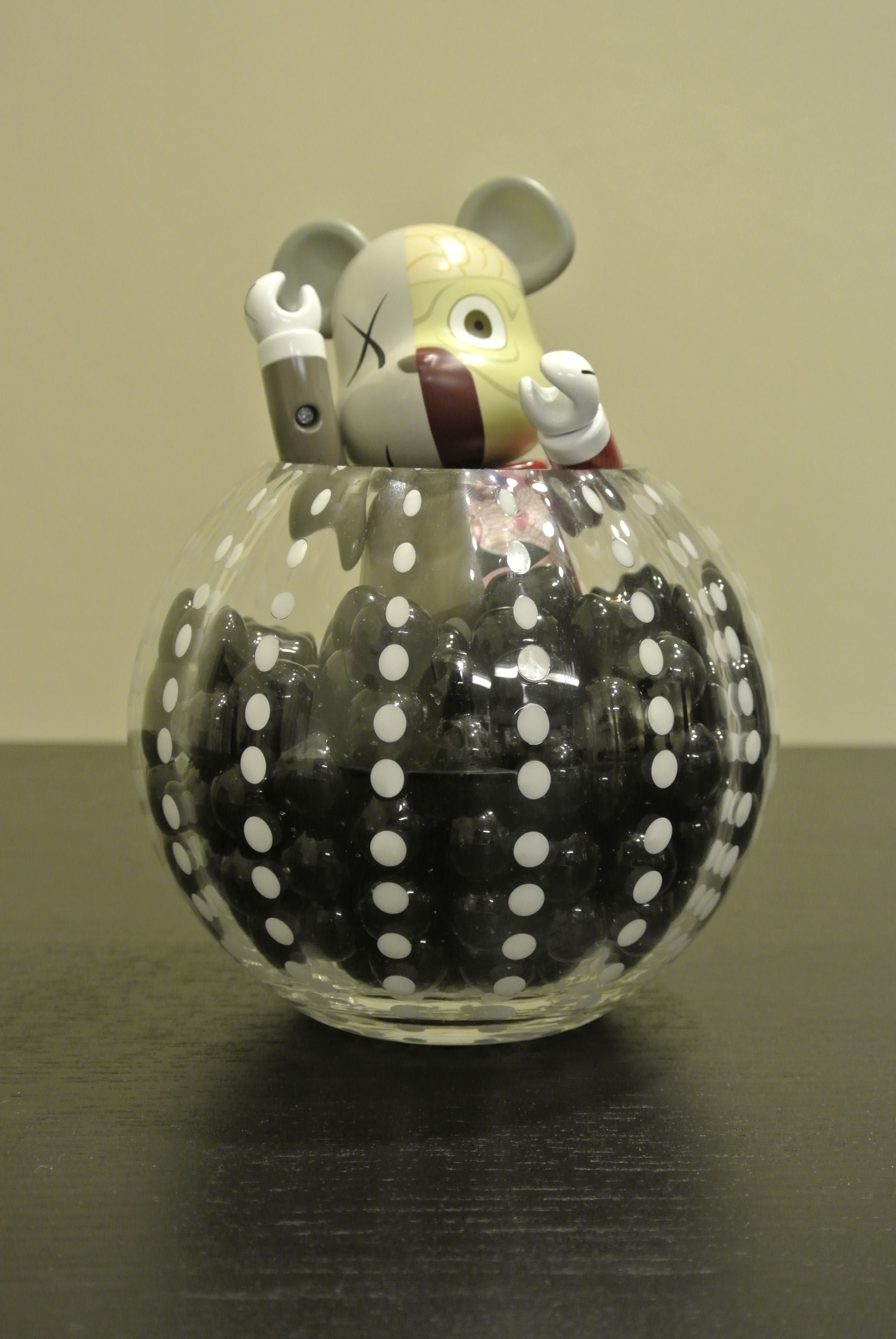 Another tasty little nugget I added to my space is a bit of a homemade art piece. I got a cute vase with a white dot pattern & partially filled it with black marbles (the kind you use for flower vases). Then, I stuck in a diecast figure from our personal toy collection & posed it as if it were trying to escape from a sinkhole. To keep the figure from wiggling around, I then filled the rest of the vase with extra marbles. I think it turned out pretty well. So far, everyone’s who has visited has complimented that this looks quite clever & creative.