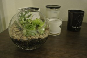 One of the first items I added was a small terrarium (which I’ve been wanting for quite some time). It’s about the size of a cereal bowl, & it was a bit pricey when I got it, but it was definitely worth the purchase. For an anti-greenthumb such as myself, this is a perfect house plant that hardly requires any maintenance (minimal). I don’t even have to water this terrarium often; it retains moisture very well to minimize frequent hydration.
