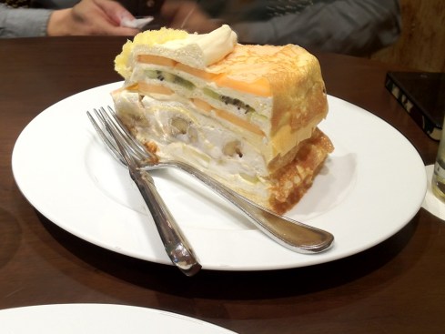 My companion ate the Mille Crêpe cake, with banana, cantaloupe, kiwi & apple fruit filling. This was an interesting mix of fruits & custard.