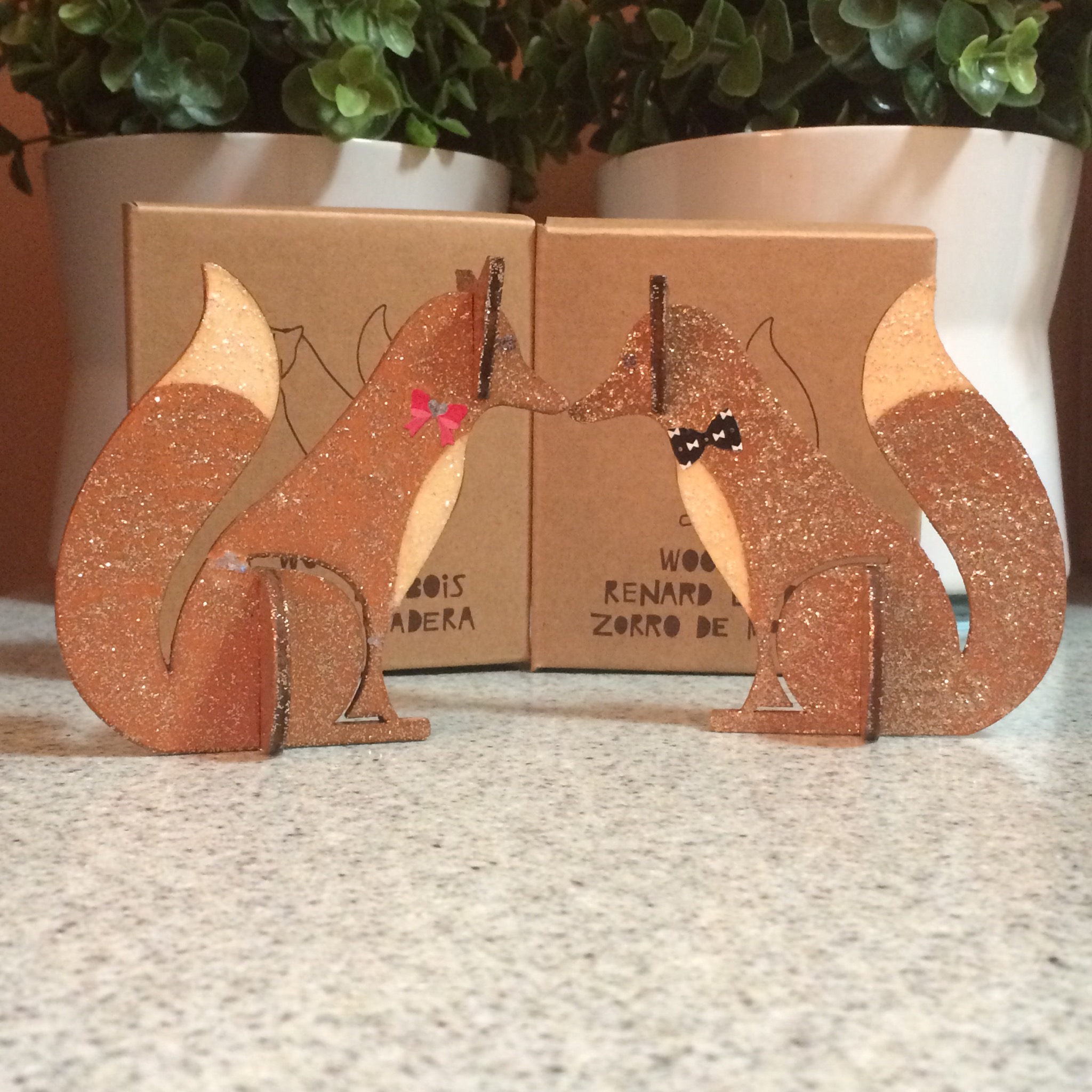 I painted the fox figures with the glitter paint & glue, making tiny black dots for the eyes. I added a black bow sticker to make a male figure & a pink bow sticker to make a female figure. I finished it up by applying Mod Podge to seal in the glitter & keep it from flaking off. Easy, right?