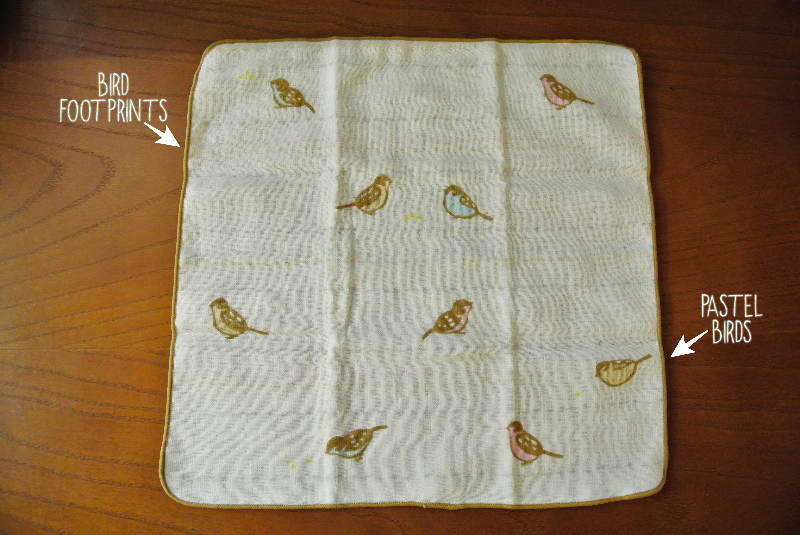 5. I recently got this (& the other two below) while I was in China. These handkerchiefs are from a Japanese brand called Hankachi (which I suspect is a shortened Japanese loanword for the full word handkerchief…a.k.a. han-ka-chiifu). Sorry for my lack of quality in these photos. I am not a professional photographer by any means, & I don’t really mind if the photos are not in super hyper HD quality…as long as you can see the photos relatively clearly & get my gist, then I’m fine with that too. Ok, so the first pattern I chose is this super cute bird pattern with stripes of bird footprints. I absolutely love this soft pastel color scheme. I am a complete sucker for soft blues, baby pinks, creamy yellows, & gray tones. Also, this handkerchief is pretty soft considering it’s got a mesh weave. The mesh weave gives the handkerchiefbreathability, which is good for when you want to wipe your brow on hot, sticky summer days.