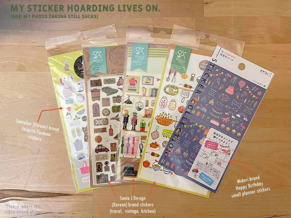 In other news somewhat related to this post, I did a mini haul of stationery goods. I didn’t go nuts on shopping this time like I have done in the past. I didn’t get much of a chance to hit up many of my favorite spots, so there really wasn’t much opportunity for me to go wild anyway. I made sure that my purchases were modest & intentional. I mean, I honestly have a huge stationery supply already. I couldn’t possibly use everything in my collection, even within the next 10 years. So this time I picked out a few much-needed everyday use pens & added 2 more sticker packs to my does-not-need-to-grow sticker stash. Also, more recently, I’ve been really into collecting mid-size to large format vinyl decal stickers.