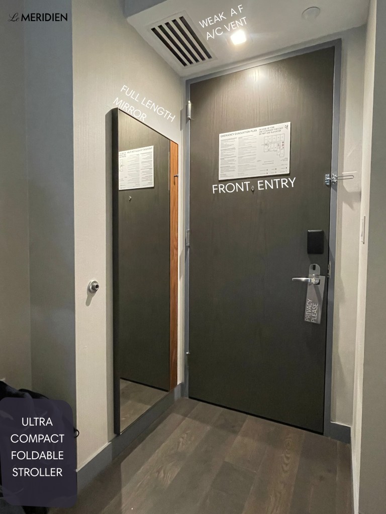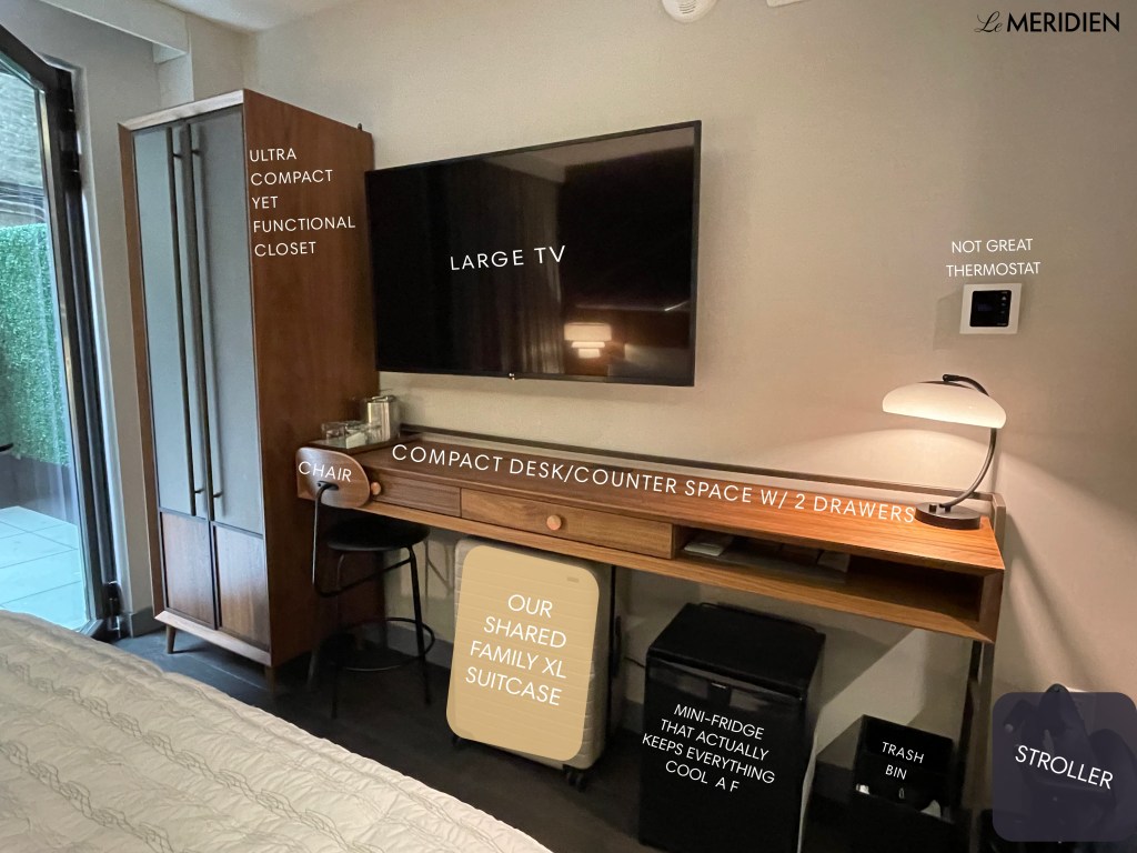 For our stay, we had originally booked a corner suite with a city view for our trio, however since we were arriving before the hotel’s check-in hours, the original room we had booked wasn’t yet available. Our little one had vomited on the plane from the bumpy landing at JFK airport (who knew she gets motion sickness like her mom?). She got a little bit of it on her clothes, which meant we were kind of desperate to get any available room so we could quickly drop off our luggage & change her clothes. Ultimately we ended up staying in a Gran King room with a terrace (a.k.a. outdoor patio), which was more than adequate for us. Here are some room photos for your reference. Please excuse the messiness. I didn’t get a chance to take any first impression pictures, & had to hastily take photos after we had already settled in.