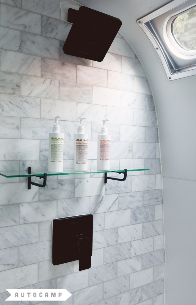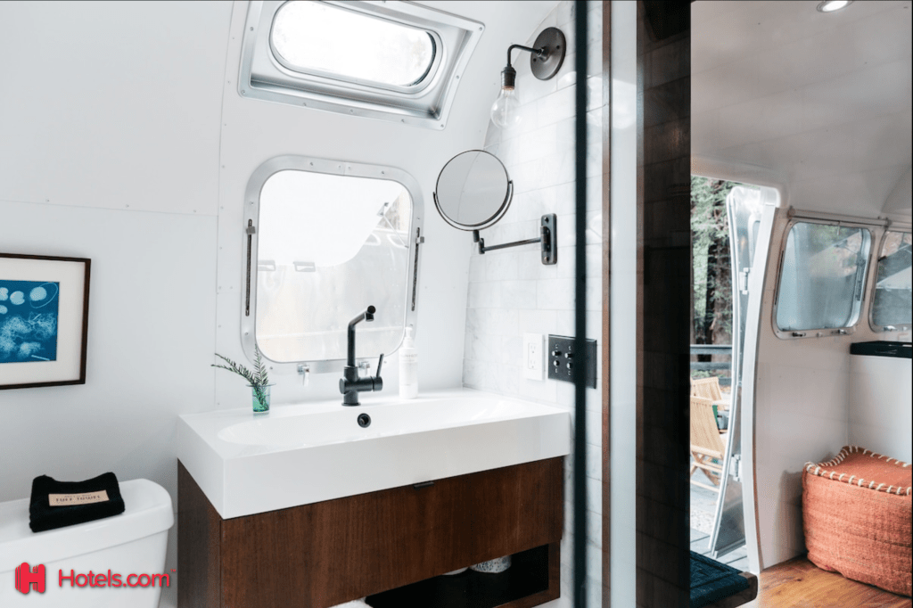 Like I had previously mentioned above, having a private shower was an absolute luxury bonus. The shower was spacious & could easily fit 2 adults. The shower head was placed high enough so that tall folks wouldn’t have to crouch to wash, at least in my opinion. Having a traditional flushing toilet at our campsite was also an added bonus. There wasn’t a ton of counter/shelving/storage space in the bathroom to store your toiletries, but the bathroom still felt highly adequate. Other added bonus features in our Airstream camper are as follows: