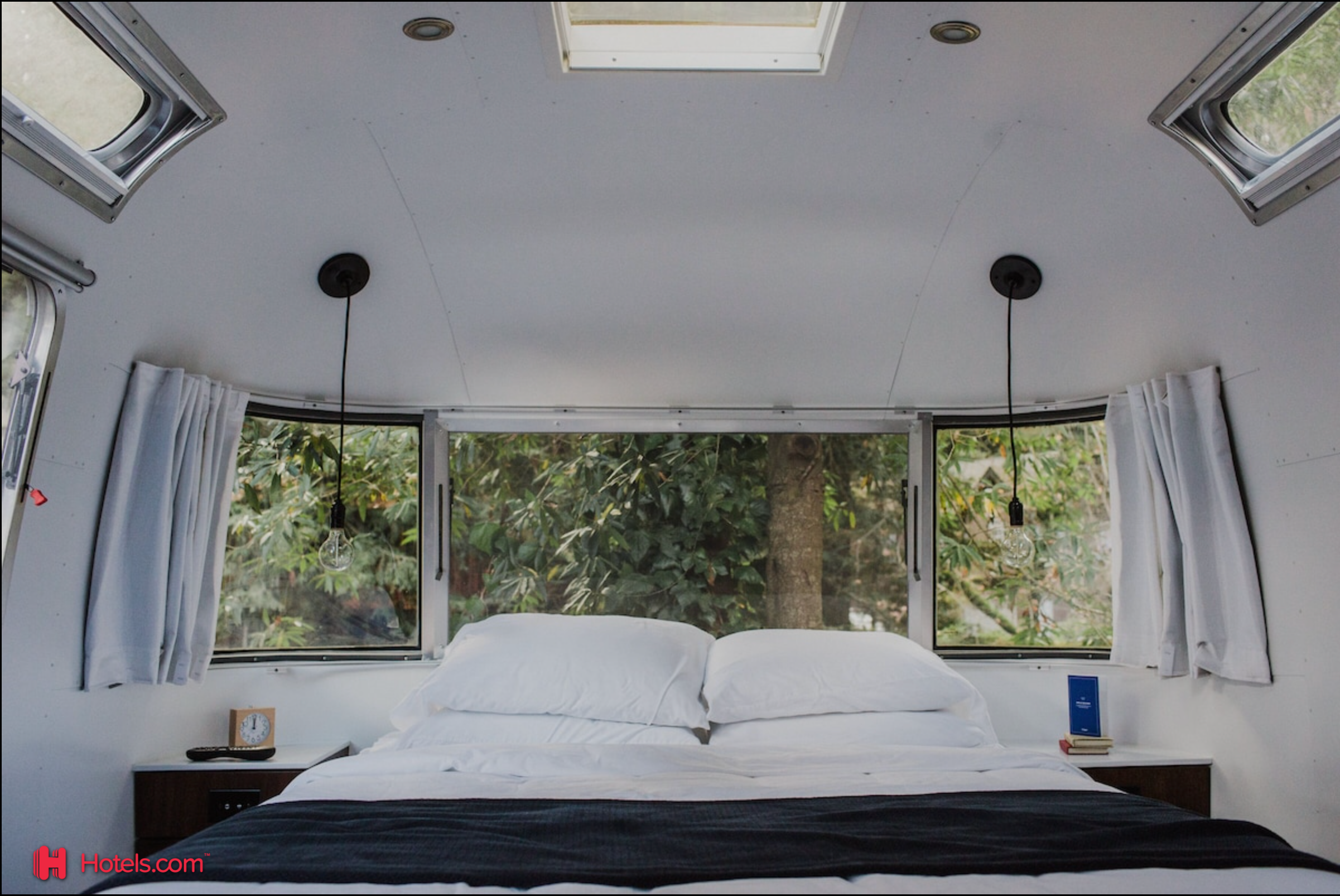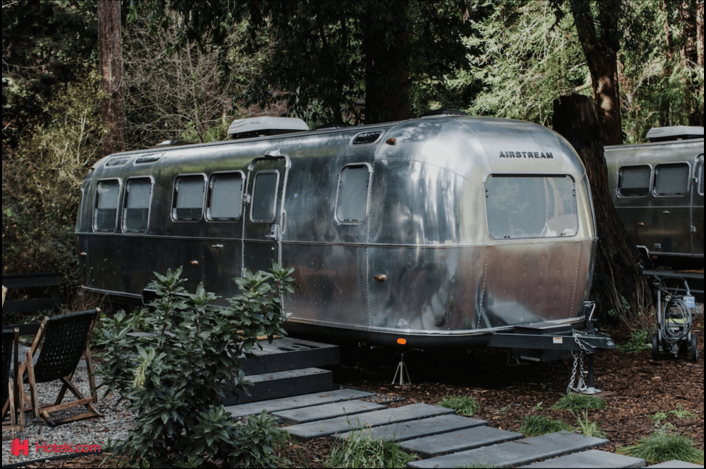 On this glamping trip, we will be celebrating Jian’s birthday in style. Yes, staying in a fully framed-out canvas tent with a comfy bed & sofa lounge area would be fun, but Jian wanted a few more creature comforts, so we initially tried to book a modular tiny cabin, but they were all booked. We ended up booking our next favorite option which was a deluxe Airstream camper, which comes complete with a private bathroom, private bedroom area, & kitchenette/seating area. See photos below for reference.
