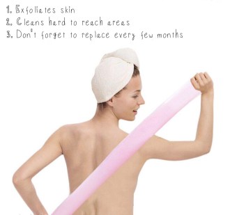 Aside from learning how to properly wear clothes, I’ve also learned how to take better care of my skin & myself…like finding the right moisturizer/lotion for my skin type. I’ve got to tell you that I’ve found something that’s completely changed my life. You might think this is totally something your Granny/Nana/Grandmother would use, but it’s transformed the way I take care of my skin. Yes, folks. I’m talking about an exfoliating bath towel. You know, those tacky-colored scarf-looking things you’ve seen your Grandma hang in her 1970’s powder blue bathroom. (Hey, these things are still popular in Asian countries.) I am not ashamed to say that I love it. I’m not a very flexible person, especially since I pulled my left shoulder muscle, & it is sometimes hard to reach all the parts of my back in the shower without a little help. This exfoliating towel does wonders to help me scrub my back.